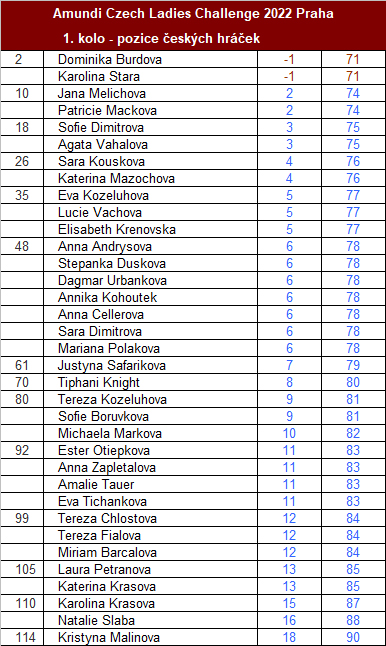 Velkolepý začátek CLC. Amatérky Dominika Burdová a a Karolína Stará dělí krásné 2. místo (-1). Do Top 10 se na dělené 10. místo se vešly ještě amatérky Jana Melichová a Patricie Macková (+2).V Top 20 je celkem šest českých hráček.