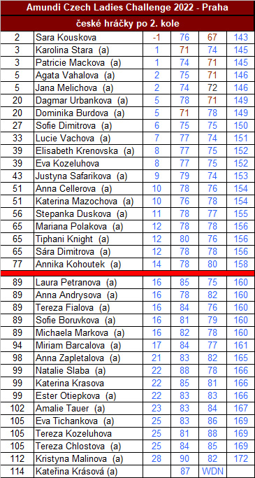 Po skvělém prvním kole přišel v sobotu další nástup českých hráček. Sára Kousková po nepovedeném začátku silně zabrala, zahrála o devět ran méně, 67 a přistála na 2. místě (-1). Třetí místo dělí další Češky, Karolína Stará a Patricie Macková (obě +1). V Top 10 je nyní pět Češek. Skutečnost zbořila také všechny odhady o cutu. Do nedělního finále postoupilo 19 českých hráček.