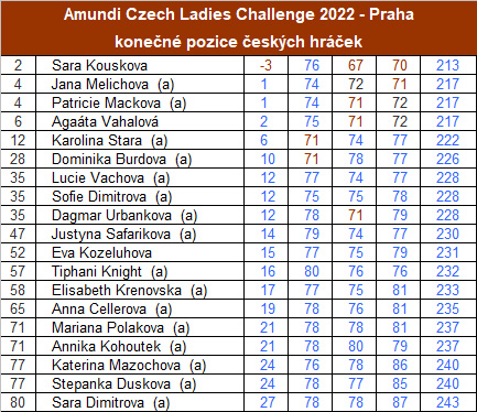 Čtvrté místo dělí další dvě Češky Jana Melichová a Patricie Macková (obě +1). Stojí za pozornost že první tři české hráčky pořadí Kousková, Melichová a Macková jsou členky klubu Prague City Golf, sídlícího na zbraslavském hřišti, kde se ACLC konalo.