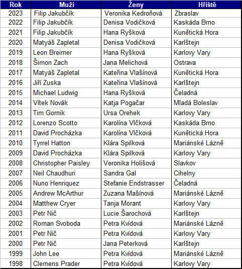 Historická tabulka Mistrů ČR na rány
