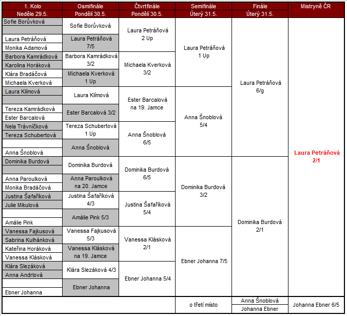 Známe finalistky. Do finále postoupily Laura Petráňová vítězstvím 6/5 nad Annou Šnoblovou a Dominika Burdová, která porazila Rakušanku Johannu Ebner 2/1.