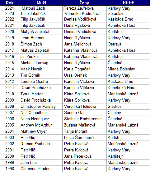 Mistrovské tituly si z Karlových Varů odváží Matouš Zach a Tereza Zavřelová. Zach si pro titul došel v rozehrávce s Němcem Otenem. Tereza Zavřelová těžila z kolapsu Veroniky Kedroňové, která v posledním kole promarnila náskok osmi úderů, získaných po třetím kole.