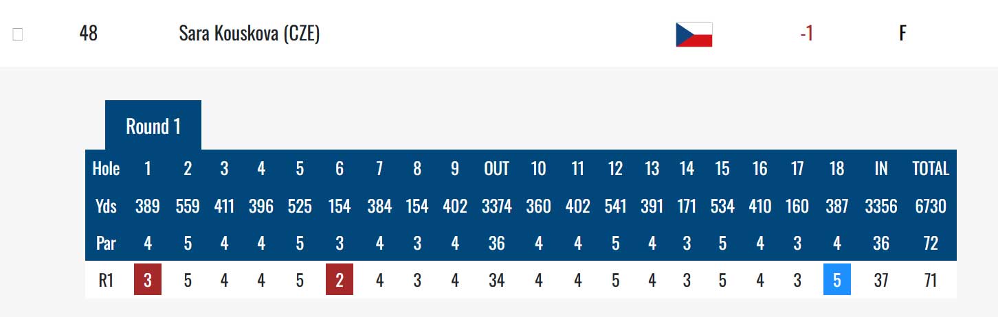 Z českých hráček je po prvním kole nejvýše v pořadí Sára Kousková. Hrála dvě birdie a jedno bogey, 71 ran, jednu pod par. Je na 47. místě (-1).