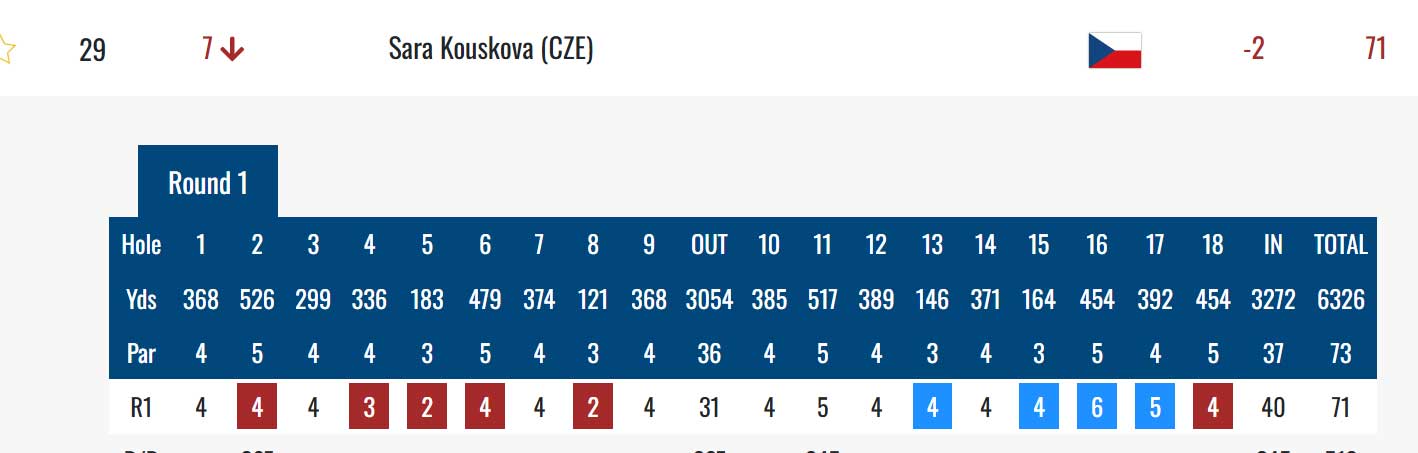 Z českých hráček je nejvýše Sára Kousková na 29. pozici. Hrála šest birdie, z toho pět v první devítce a čtyři bogey  v druhé devítce s jedním birdie na závěr, 71 ran, dvě pod parem.