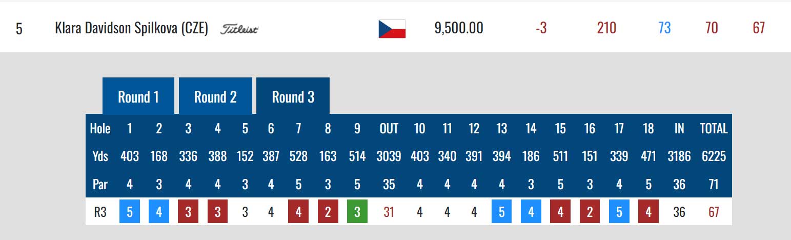 Závěrečným finišem vylétla Davidson Spilková z 20. na konečné, dělené 5. místo. Hrála eagle, sedm birdie a pět bogey, 67 ran a získala odměnu 9.500 Eur.