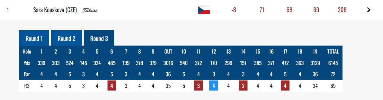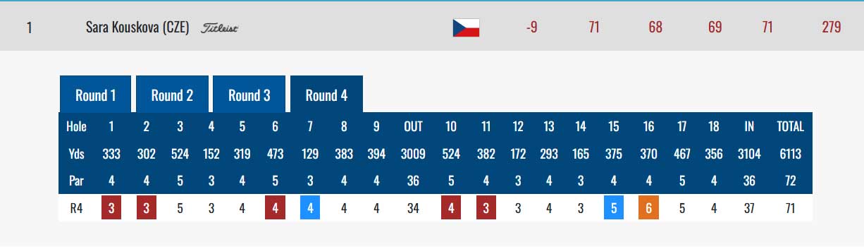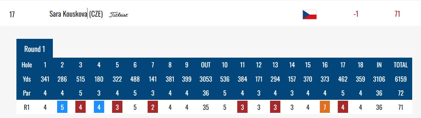 Sára Kousková je z Češek nejvýše umístěná. Hrála šest birdie, dvě bogey a jedno triple bogey, 71 ran, jednu po par a postavila se na 17. místo.