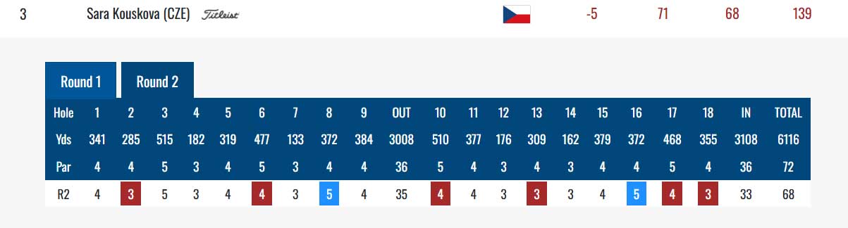 Sára Kousková dnes přinesla skvělý výsledek, šest birdie a dvě bogey, 68 ran a posunula se do Top 10 na dělené 3. místo (-5).