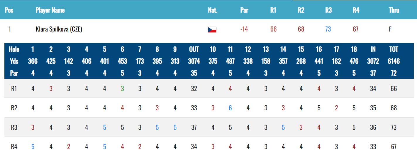 Berdíkem na poslední jamce skončila Klára na skore -14. Dánka Nicole Broch Estrup dosáhla stejného skore třemi berdíky od patnáctky do sedmnáctky. O vítězství nebo playoff se rozhodovalo na její poslední jamce. Broch Estrup putt do birdie neproměnila. Míček se jí zastavil na hraně jamky. Šlo se do playoff, do kterého se vešla ještě Ursula Wikstrom.