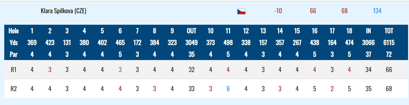 Klára Spilková odehrála další skvělé kolo, 68 ran a postoupila na 2. místo, dělené s Dánkou Sonderby a Španělkou Alonso (všechny -10).