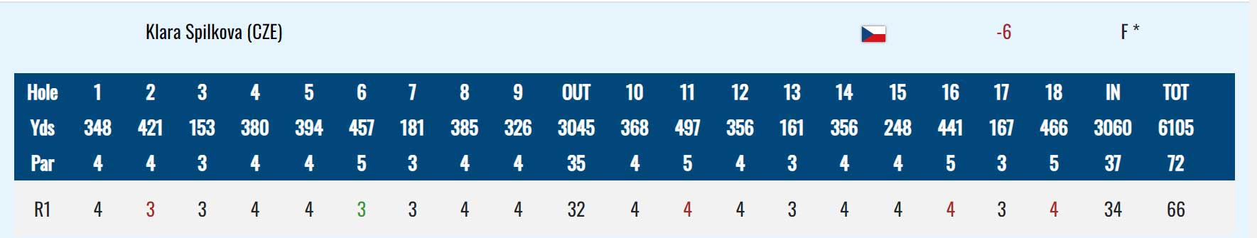 Velmi dobře odstartovala Jana Melichová. Sedm birdie, tři bogey a jedno double bogey daly výsledek 70 ran, dvě pod par a je na 27. místě pořadí (-2).