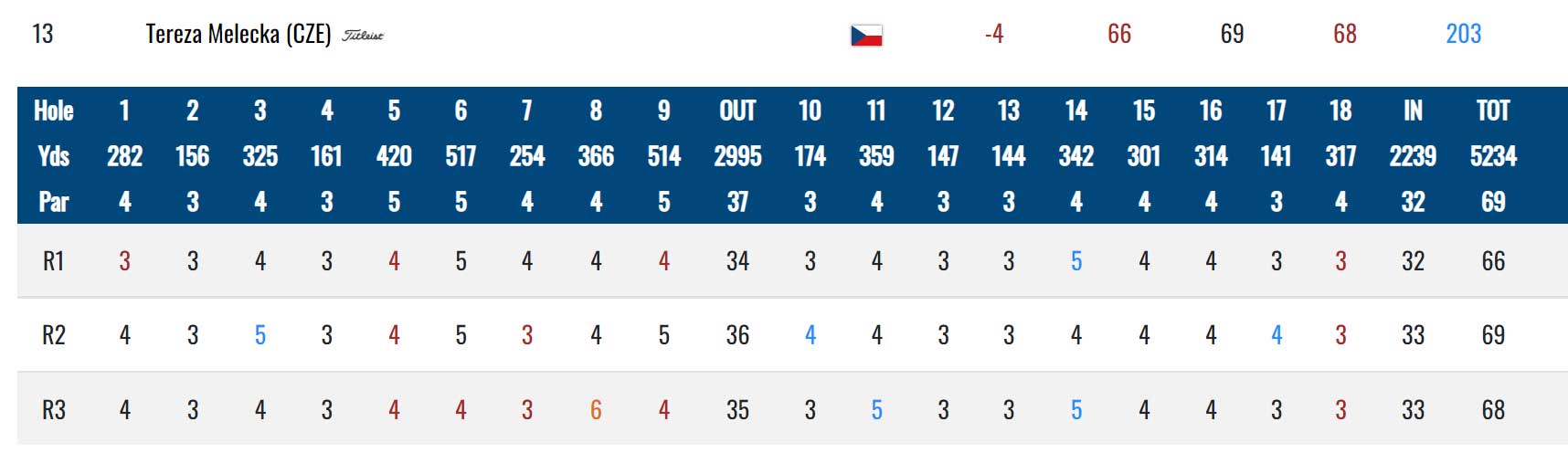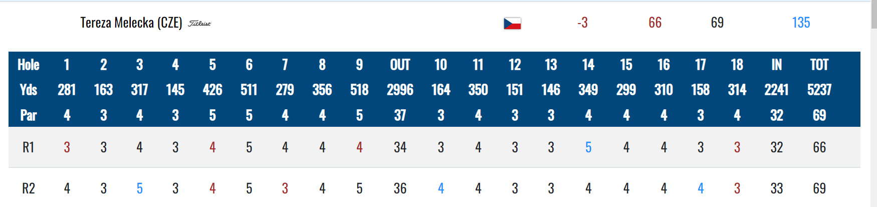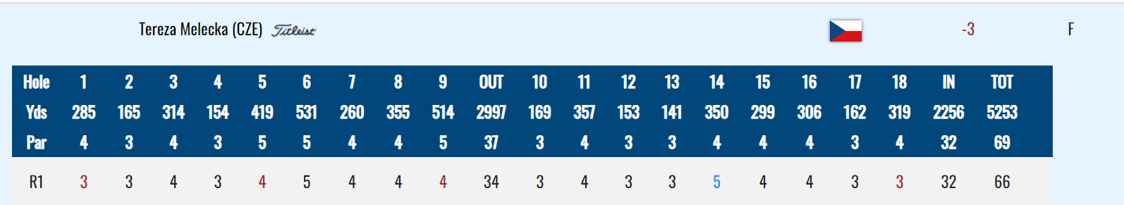 Nejlepší výkon podala Tereza Melecká. Hrála čtyři birdie a jedno bogey, 66 ran, tři pod parem a je na 11. místě.