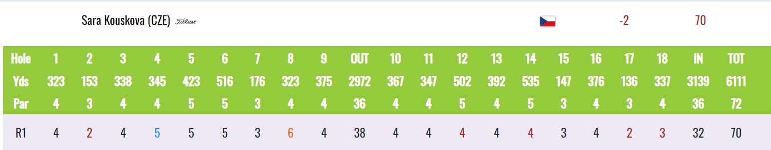 V první kole byla nejlepší Češkou Sára Kousková. Hrála pět birdie, jedno bogey a jedno double bogey, 70 ran, dvě pod par a zařadila se na 10. místo.