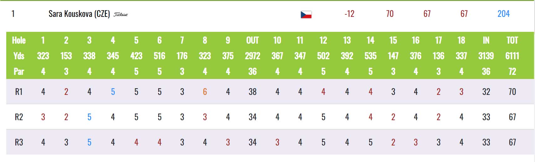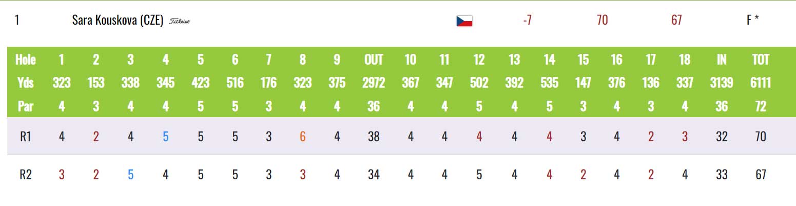 Sára Kousková exceluje. V druhém kole hrála šest birdie a jediné bogey, 67 ran, pět pod par a vystoupala na vrchol výsledkové listiny. Vede o dva údery před čtveřicí Noja, Jimenéz, Diez a Moosnam (-5).