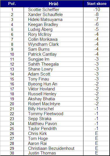 Další pořadí: 5. Schauffele (-8), 11. McIlroy (-6), 13. Cantlay (-5), 28. Morikawa (-1), 33. Scheffler (+1).