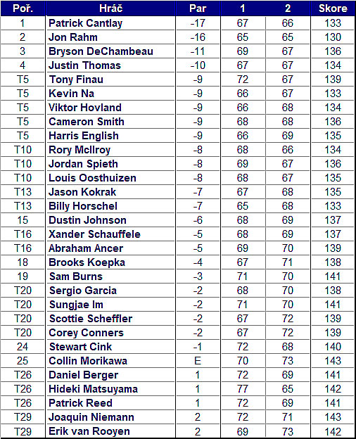 Patrick Cantlay startoval se skore -10. Hrál čtyři birdie a jedno bogey 67 ran a zůstává ve vedení (-13). O dvě rány dále je na druhém místě Jon Rahm (-11), který jako čtvrtý na žebříčku startoval se skore -6. Zapsal sedm birdie a dvě bogey, 65 ran.