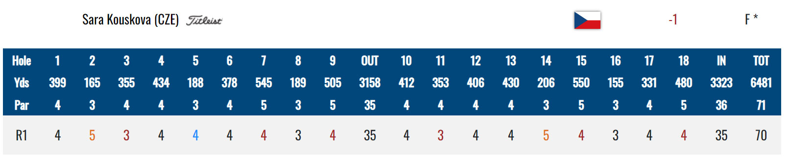 Z českých hráček začala nejlépe Sára Kousková. Zapsala šest birdie, jedno bogey a dvě double bogey, 70 ran, jednu pod par. V dohrávaném kole je mezi světovou elitou v Top 10, na skvělém 5. místě.