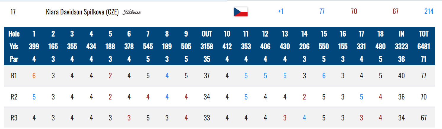 Do turnaje vykročila špatnou nohou naše jednička Klára Davidson Spilková. Startovala z 15. jamky, na které zahrála bogey. Na páté jamce zahrála double bogey, na desáté jamce přišlo první a poslední birdie. Následovaly čtyři bogey, z toho tři v řadě od patnáctky do sedmnáctky. Celkem 77 ran (+6) a je na 96. pozici.