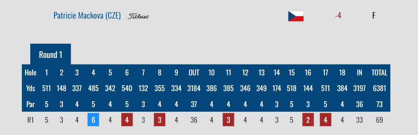 Patricie Macková hrála dvě birdie, čtyři bogey a dvě double bogey, 79 ran, šest nad par. Patří jí aktuální 68. místo.