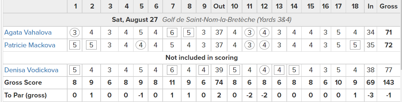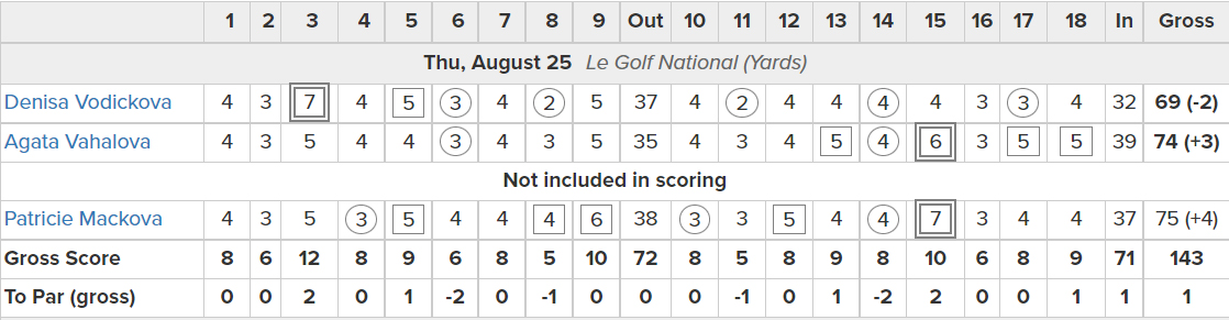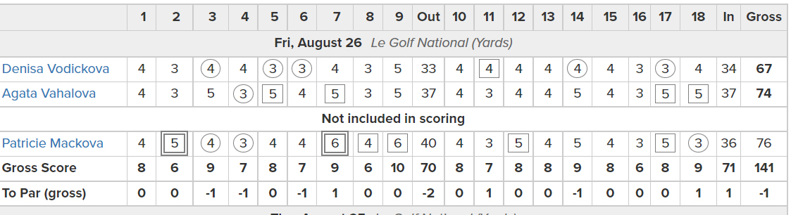 Dnes se započítaly výsledky Denisy Vodičkové a Agáty Vahalové. Hrálo se na Le Golf National. Vodičková hrála na prvních pěti jamkách double bogey a bogey, tři nad par. Na zbylých třinácti jamkách zapsala čtyři birdie a došla kolo s výsledkem 69 ran, dvě pod par.