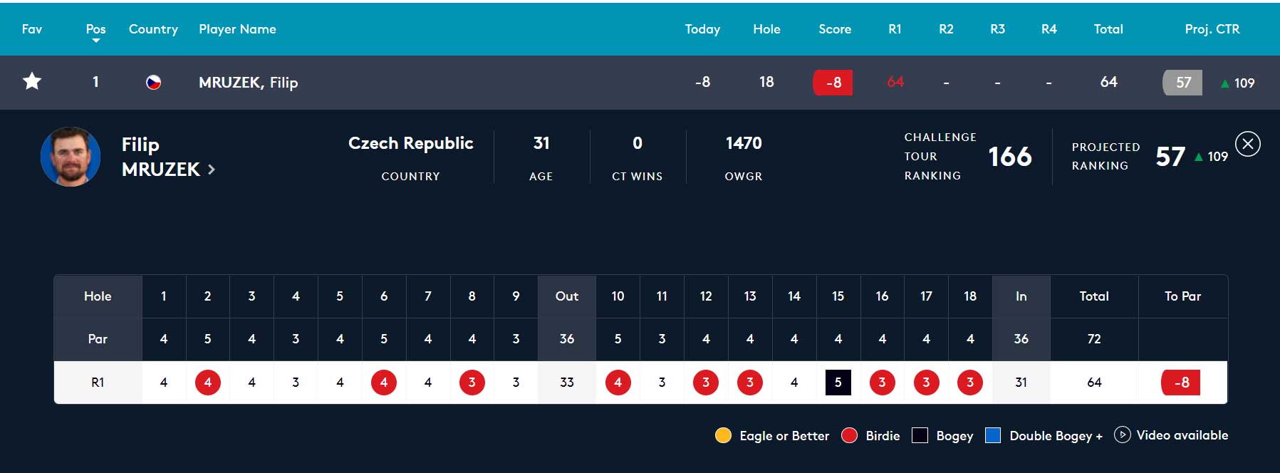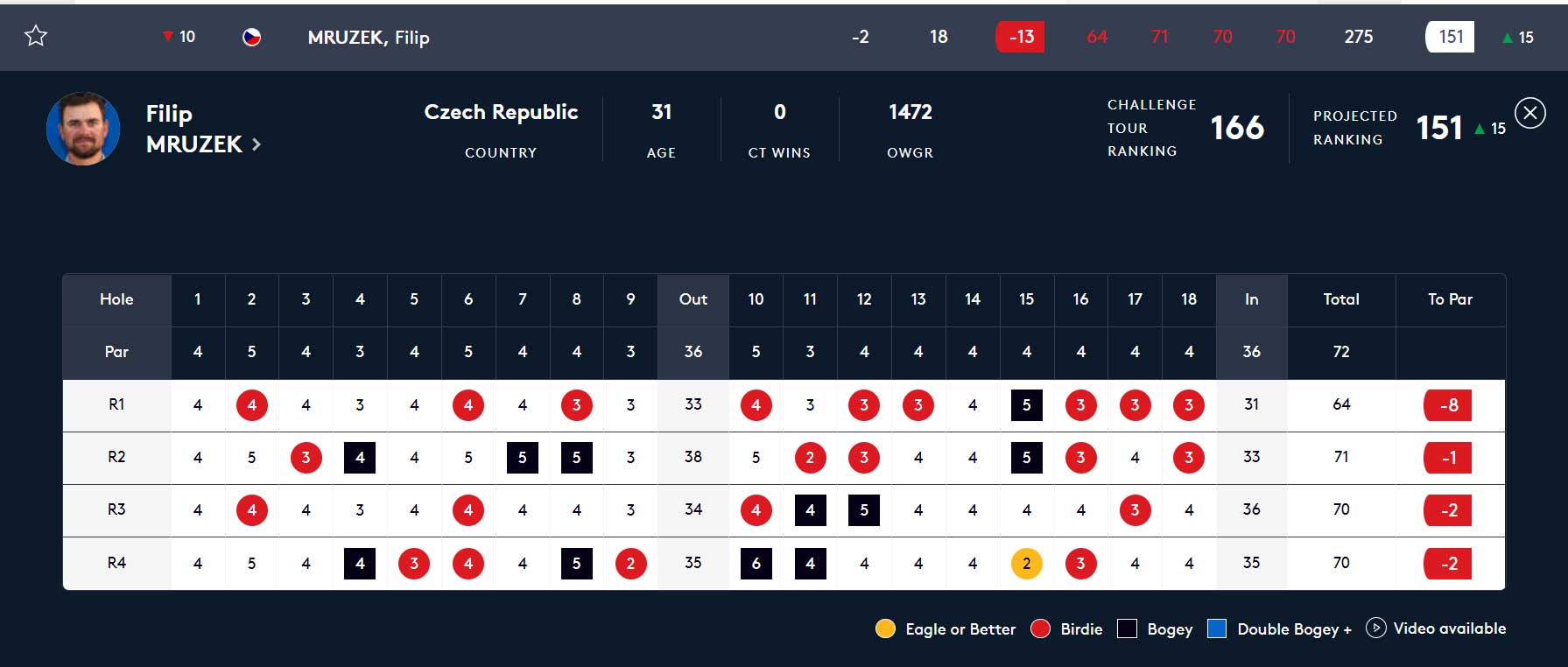 Filip Mrůzek j na dohrávaných šesti jamkách zahrál tři bogey bez birdie a srazil své skore na -9 a klesl na 17. pozici.