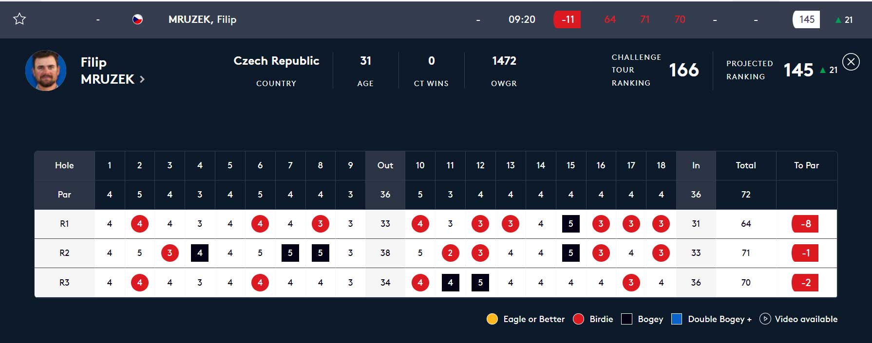 Ve třetím kole hrál Filip Mrůzek čtyři birdie a dvě bogey, 70 ran, dvě pod par. Udržel se na 17. místě (-11).