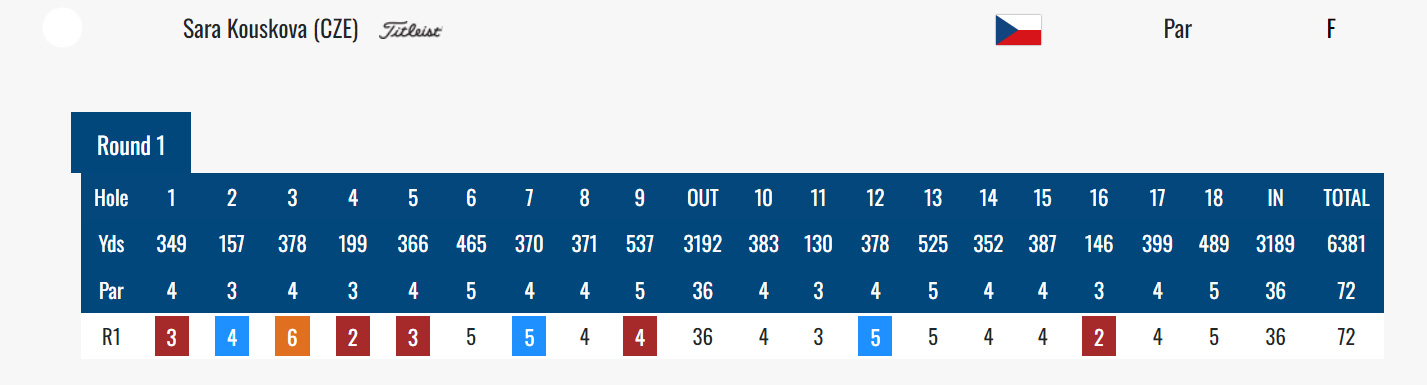 Sára Kousková měla první bohatou devítku v paru, ve které zapsala čtyři birdie, dvě bogey a jedno double bogey. V druhé devítce zahrála po jednom birdie a bogey, celkem 72 ran v paru. Zařadila se na 29. místo (E).