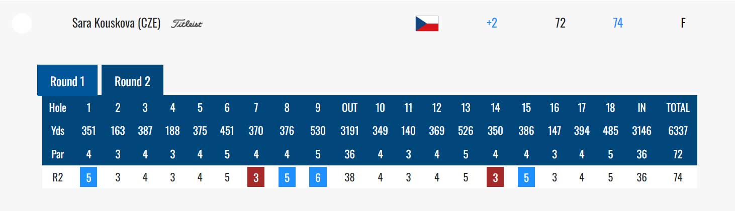 V druhém kole hrála Kousková o dvě rány více, dvě birdie a čtyři bogey, 74 ran. Výsledek zařadil českou hráčku na 31. místo (+2).