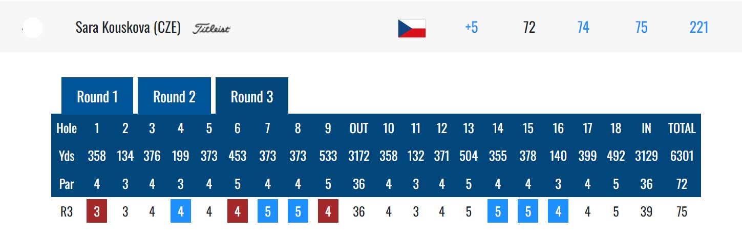 Ve třetím kole hrála Kousková o další ránu více, než v předchozí den 75. Zapsala tři birdie a šest bogey a ustoupila na 42. pozici (+5).