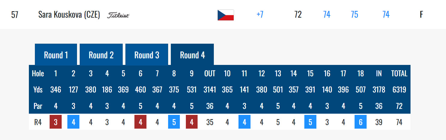 Sára Kousková poslední hrací den zapsala tři birdie a pět bogey, 74 ran dvě nad par, celkem +7. Konečné umístění na 57. místě s odměnou 3.932 dolarů.